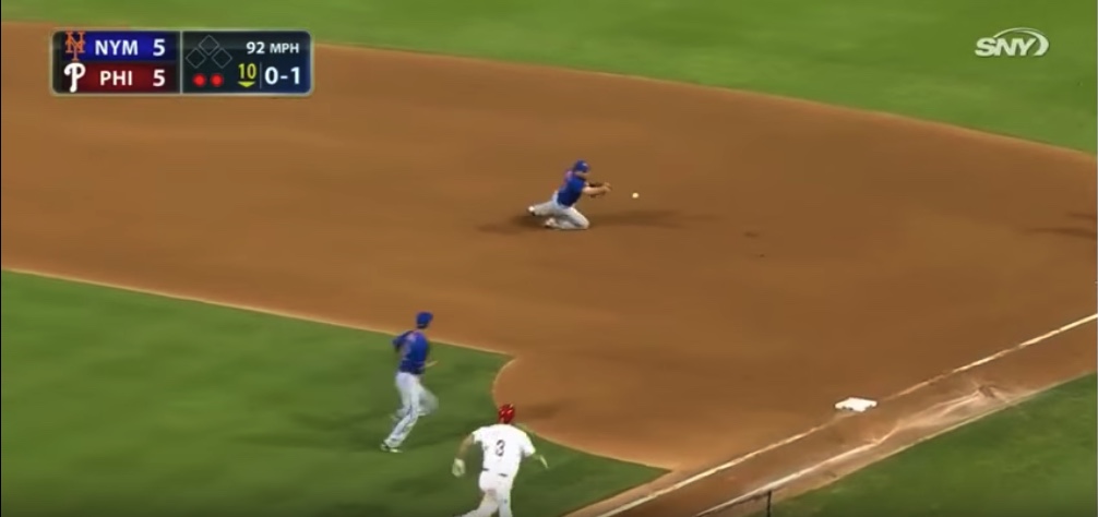I love everything about this about this video, the ball caroms off of Torres leg and Murphy has to dive away from the bag with his back turned and flip to an incoming Torres. Absolutely beautiful to watch Murphy make this play because it is incredibly harder than it seems. Murphy was already taking a step to cover first when he would have to switch directions on a dime and dive away from the bag. With his back towards the infield he has to take a complete guess as to where first base would be and give Torres a chance to catch the ball and tag the base. The ball perfectly leads Torres right to the bag making for an incredible play to end the game. What makes the play even better is the call, definitely Top Ten worthy.